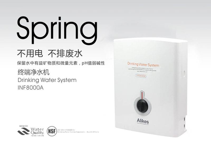 Alikes凈水機(jī)是對(duì)市政自來(lái)水或可以飲用的地下水進(jìn)行二次深度凈化處理的終端水處理設(shè)備,出水品質(zhì)符合衛(wèi)生部《生活飲用水水質(zhì)衛(wèi)生規(guī)范》(2001)的規(guī)定。凈水機(jī)利用市政管道自來(lái)水的壓力驅(qū)動(dòng)水流,通過(guò)獨(dú)特的濾芯來(lái)達(dá)到生飲的標(biāo)準(zhǔn)。陶瓷芯可去除水中的泥沙、******、鐵銹、懸浮物,終身刷洗120次;KDF可去除有害重金屬;燒結(jié)活性炭吸附水中余氯、異色和異味。不需用電,不產(chǎn)生廢水,即用即飲,不需儲(chǔ)水罐避免二次污染。內(nèi)置流量計(jì)根據(jù)用水量自動(dòng)斷水確保飲水健康。是凈水機(jī)中的高端產(chǎn)品。